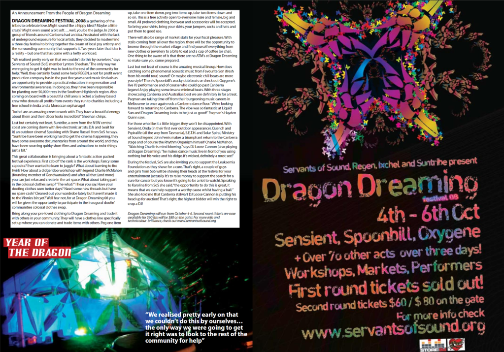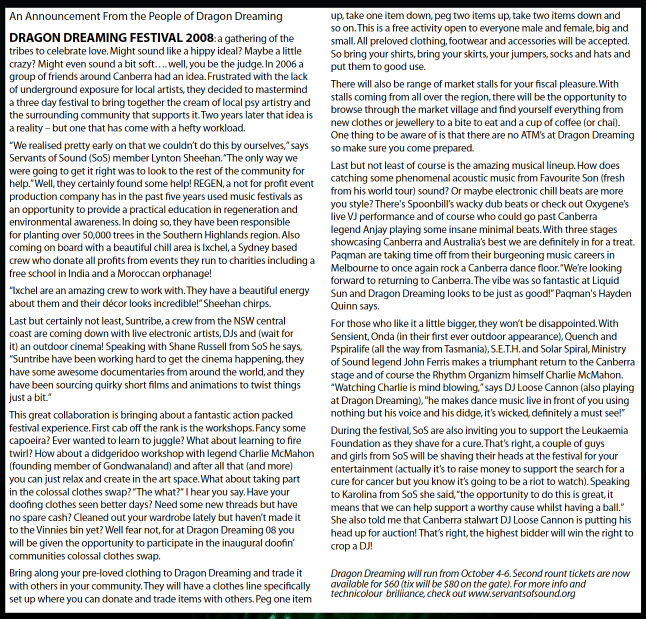 One such example is Dragon Dreaming Festival, a project in which I was involved as co-founder and director. During that time one of the key grants I won was funded by the ACT Government, with an injection of $5,000 and a seat at the committee table for the opening ceremony of the Belconnen Arts Centre in 2009. This immense opportunity propelled many musicians and performers into the spotlight, allowing them to share the stage during the opening with ACT Chief Minister Jon Stanhope and receive much needed media exposure for both themeselves and the fledgling festival. Annually, in the lead up to the festival, I liaised with my local media networks (including BMA Mag and The Riot Act) to promote ticket sales for the festival, including drafting of articles and preparation of images for publication.